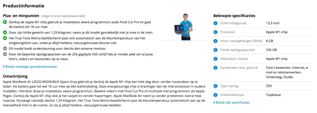 Een handige manier om dit te doen is het gebruik van bullet points. Hiermee creëer je een overzichtelijke structuur waardoor bezoekers snel kunnen scannen. In één oogopslag kunnen ze dan beoordelen of het product aan hun verwachtingen voldoet, waardoor je hun aandacht en interesse vasthoudt.