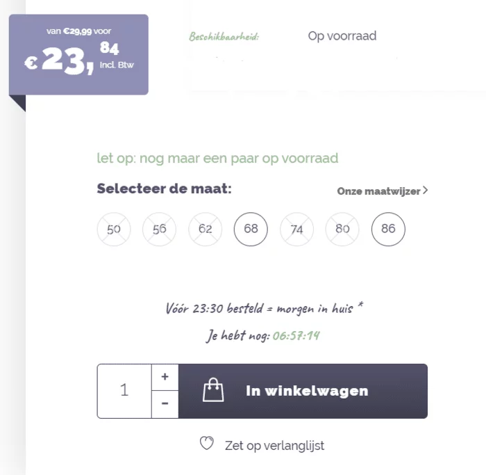Als je op zoek bent naar een product en je ziet dat er “nog maar 2 stuks op voorraad” zijn, ben je dan sneller geneigd om het te kopen? Het antwoord is ja. Schaarste werkt bijna altijd. Pas dit dus ook toe in je eigen webshop.