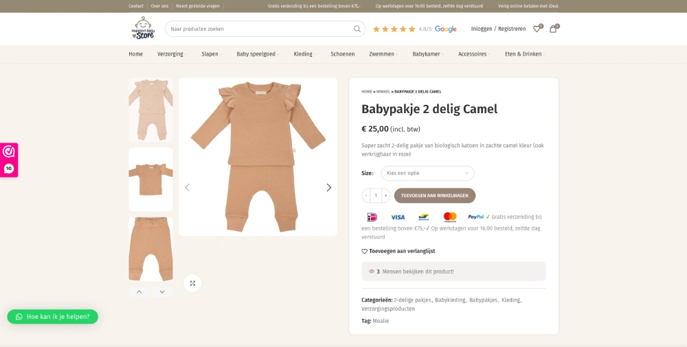 Verder hebben we het keurmerk Webwinkelkeur aan de webshop gekoppeld en heeft de shop een Whatsapp functie om klaar te staan voor klantvragen.